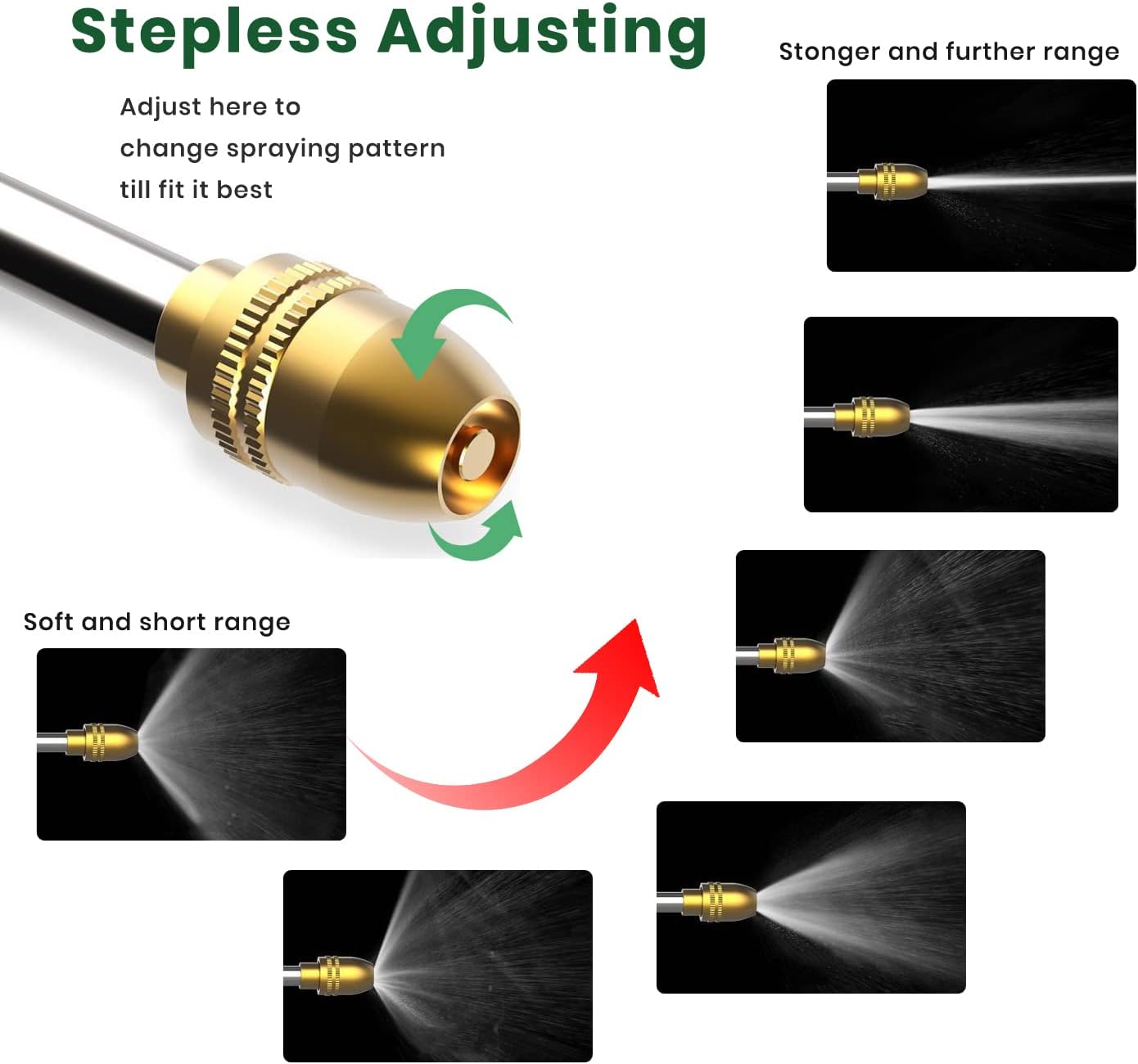 • STEPLESS ADJUSTING SPRAYING-Adjusting Spraying mode by rotating the head of nozzle to fit various demands for you,including cleaning your car, walkway,deck, home,yard,lawn,pets,etc.Water flow changed from soft and larger range to further and small range by adjusting spraying head.